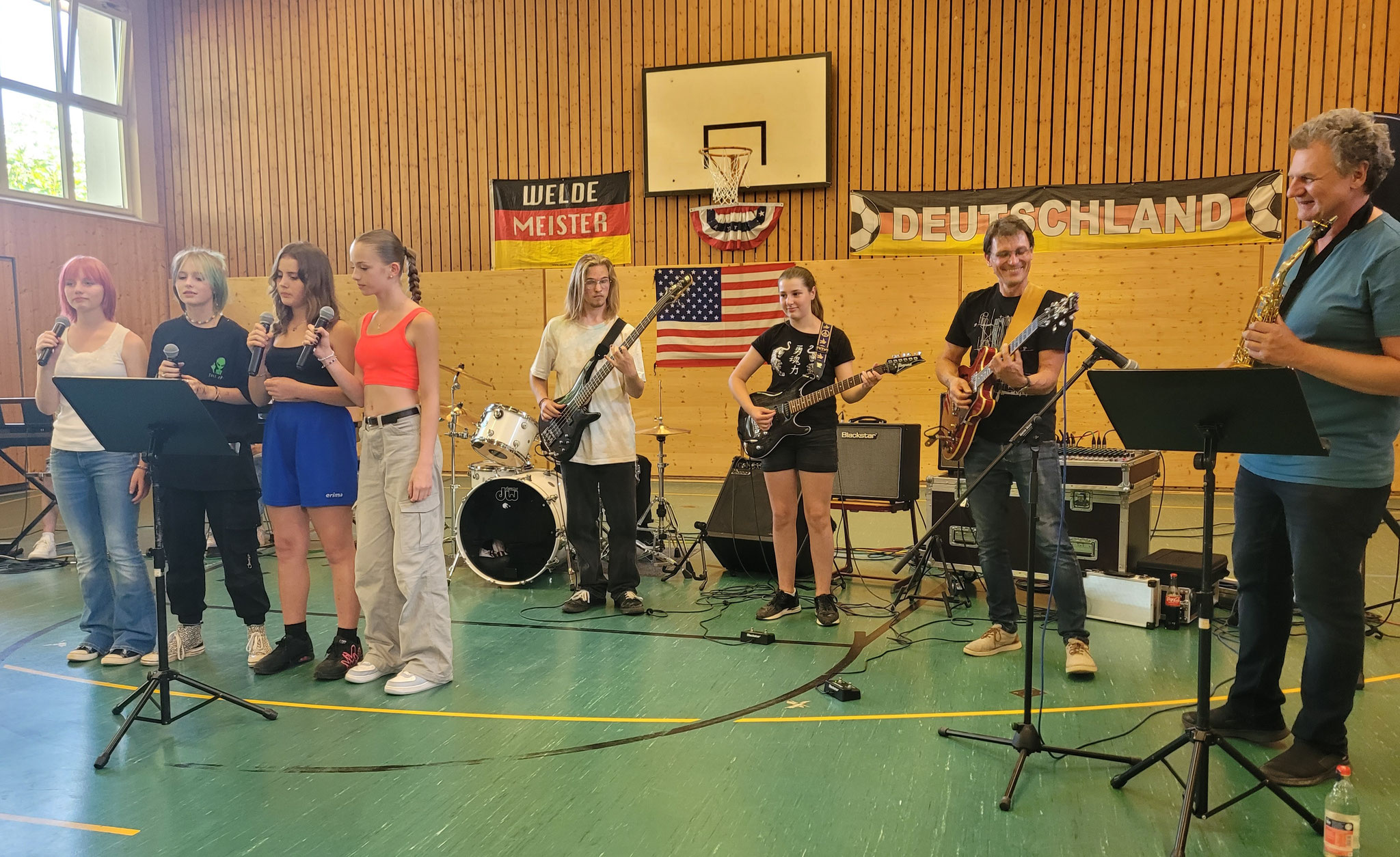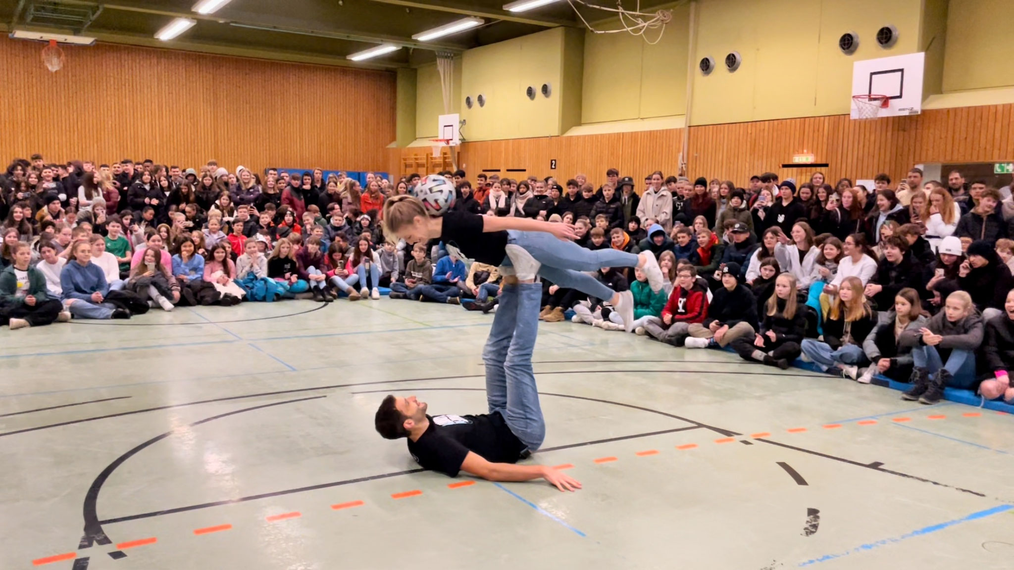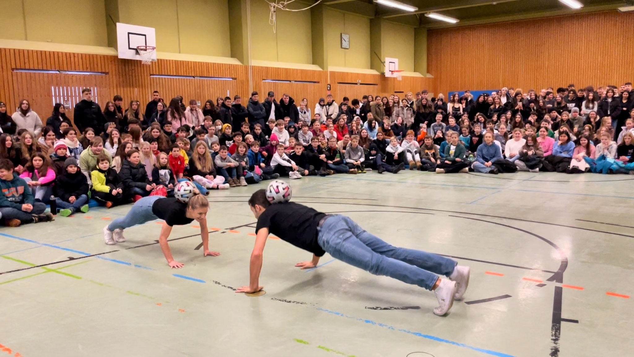 Sie begeisterten über 500 Schülerinnen und Schüler mit ihren außergewöhnlichen und mitreißenden Tricks. Außerdem gaben sie einen kurzen Einblick in ihr Leben als „Influencer“ und ihre Treffen mit Fußball-Idolen auf der ganzen Welt.