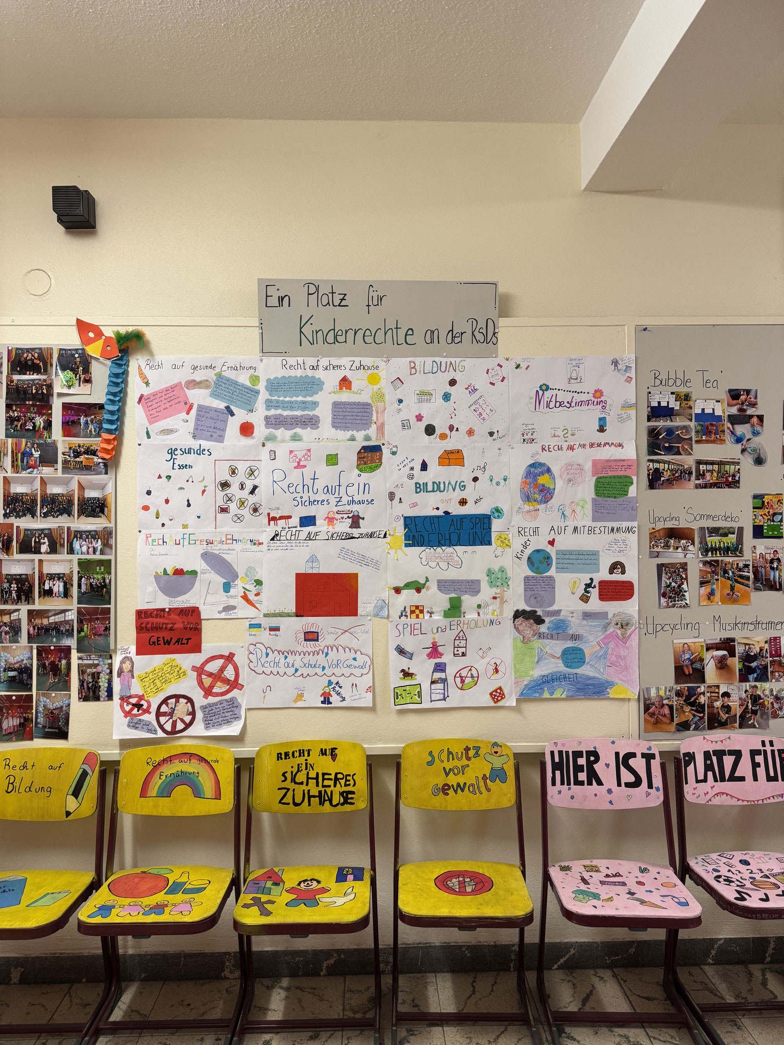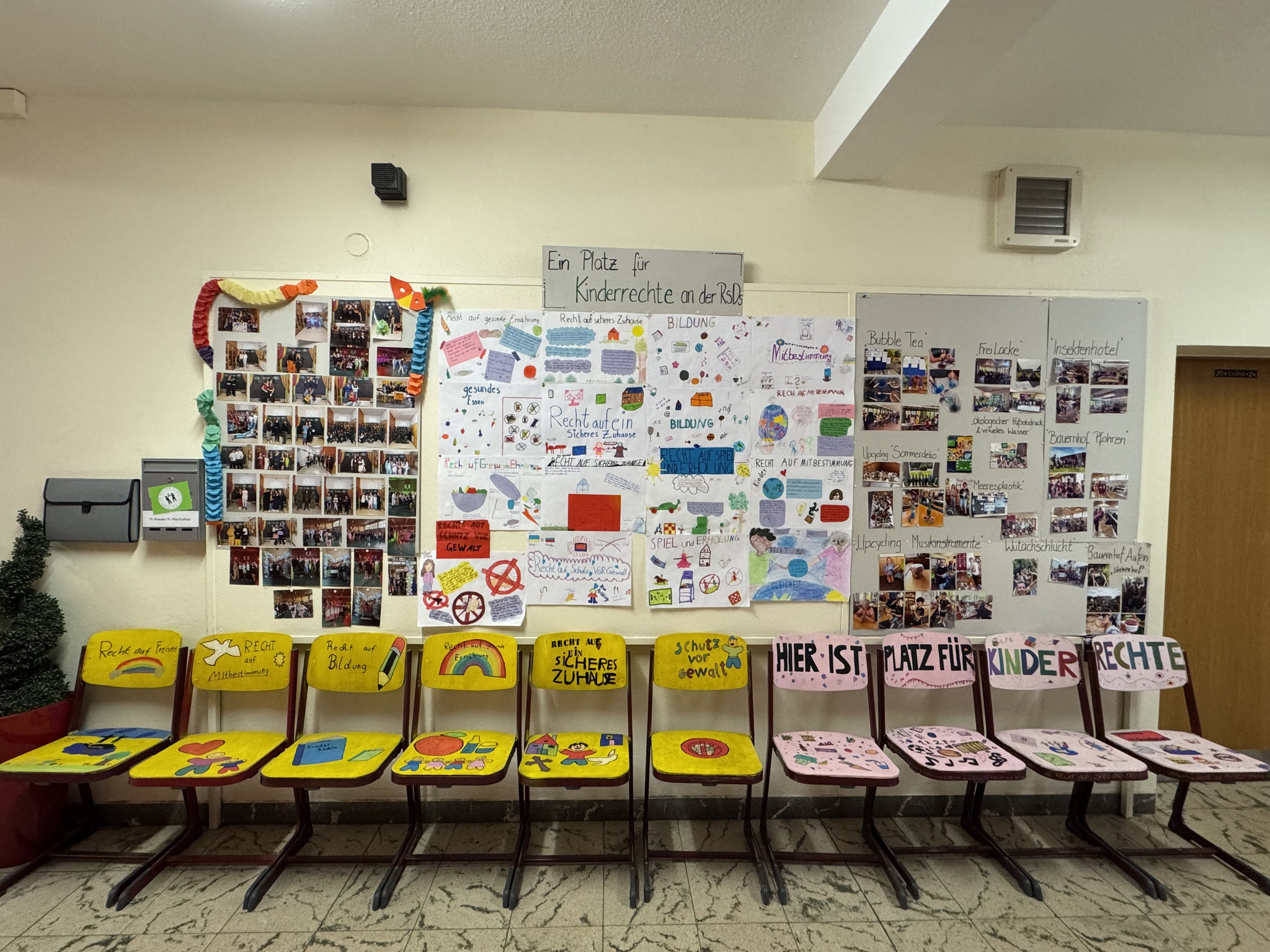 auseinander. Ein besonderes Highlight war die kreative Aktion, bei der die Schüler*innen Stühle vor dem Sekretariat bemalten. Jedes Kunstwerk thematisierte ein spezifisches Kinderrecht und