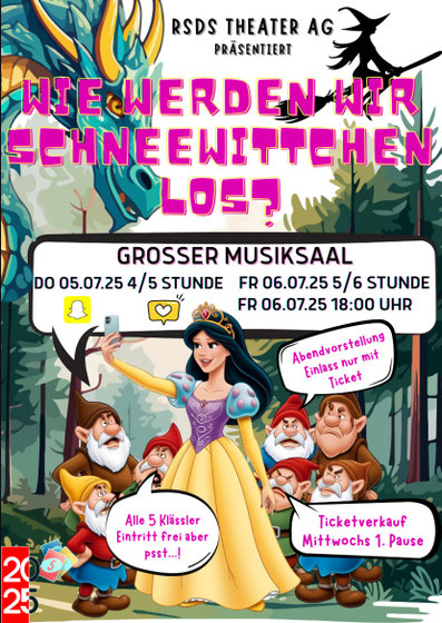 Erster Auftritt unserer Theater AG: Am 05.07. und 06.07.2025 präsentiert unsere Theater AG das Stück "Wie werden wir Schneewittchen los?". Für die Schüler/-innen finden die